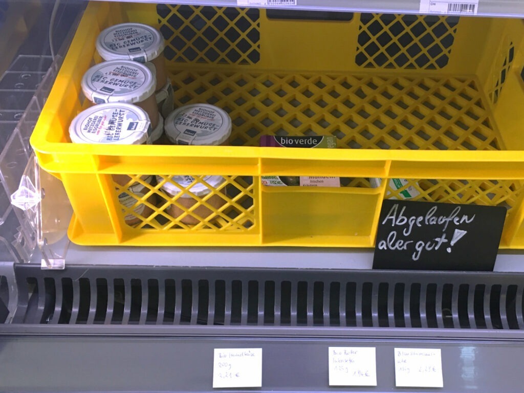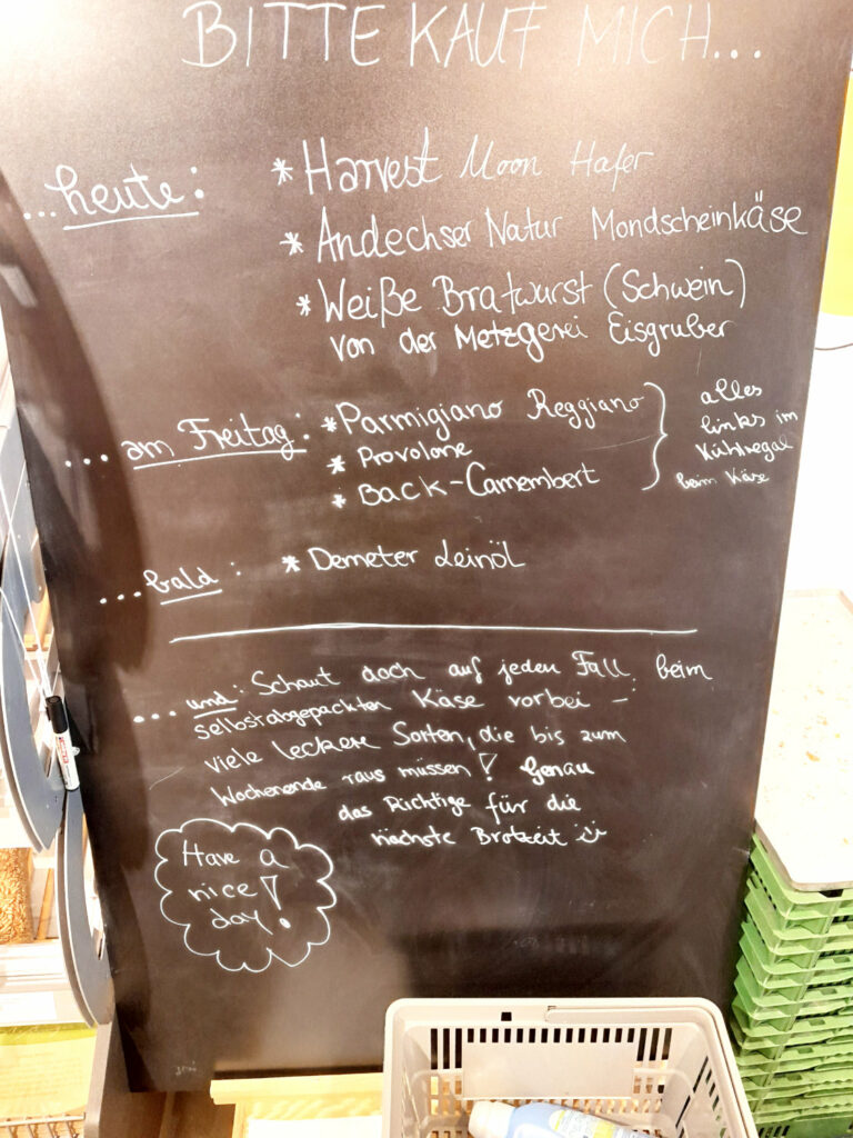 Gleich beim Eingang ist eine Empfangstheke mit einer großen Kreidetafel. Hier haben immer zwei Mitglieder Schicht. Die Tafel gibt Auskunft über die Ware, die bald abläuft, auch Brot von vorgestern wird verkauft. Nach dem Motto: „Vermeide Abfall!“ wird informiert – ohne Rabatte auf die Ware zu geben.