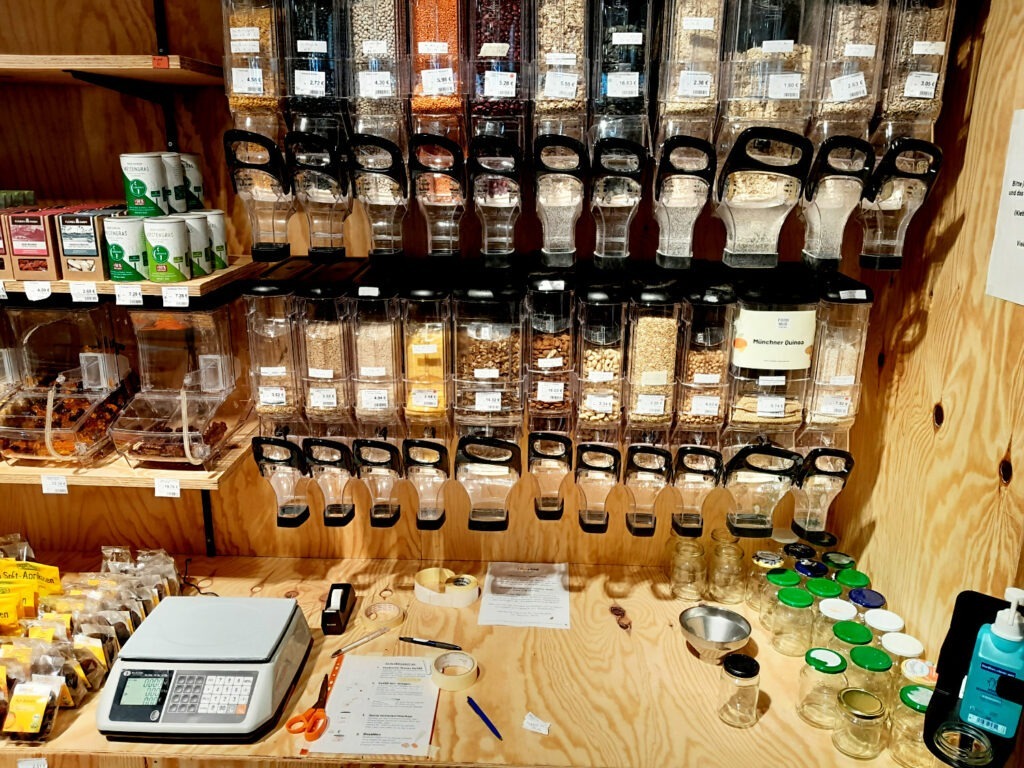 Der FoodHub hat knapp 350 Quadratmeter Verkaufsfläche und etwas weniger Lagerfläche, die sich im Keller befindet. Zusätzlich haben sie im Verkaufsraum einen Abpackraum eingerichtet: Hier wird der Käse aufgeschnitten und für den Verkauf foliert, wie auch Nüsse und Trockenwaren für den Unverpackt-Bereich vorbereitet. Letzteres spart Plastik und ermöglicht einen günstigeren Preis.