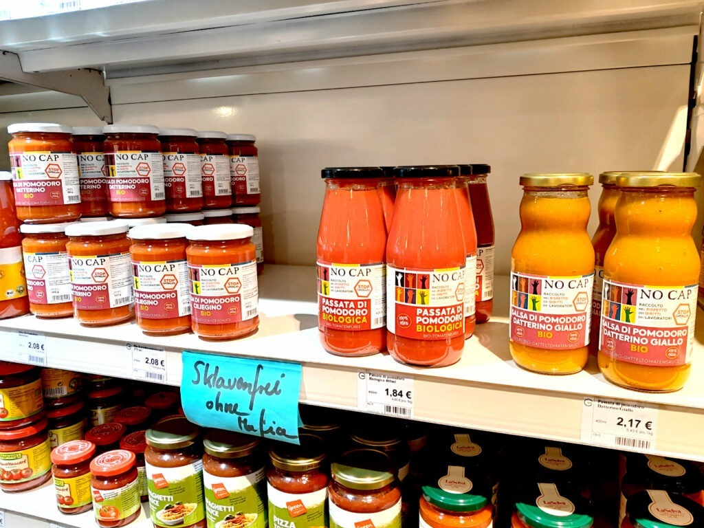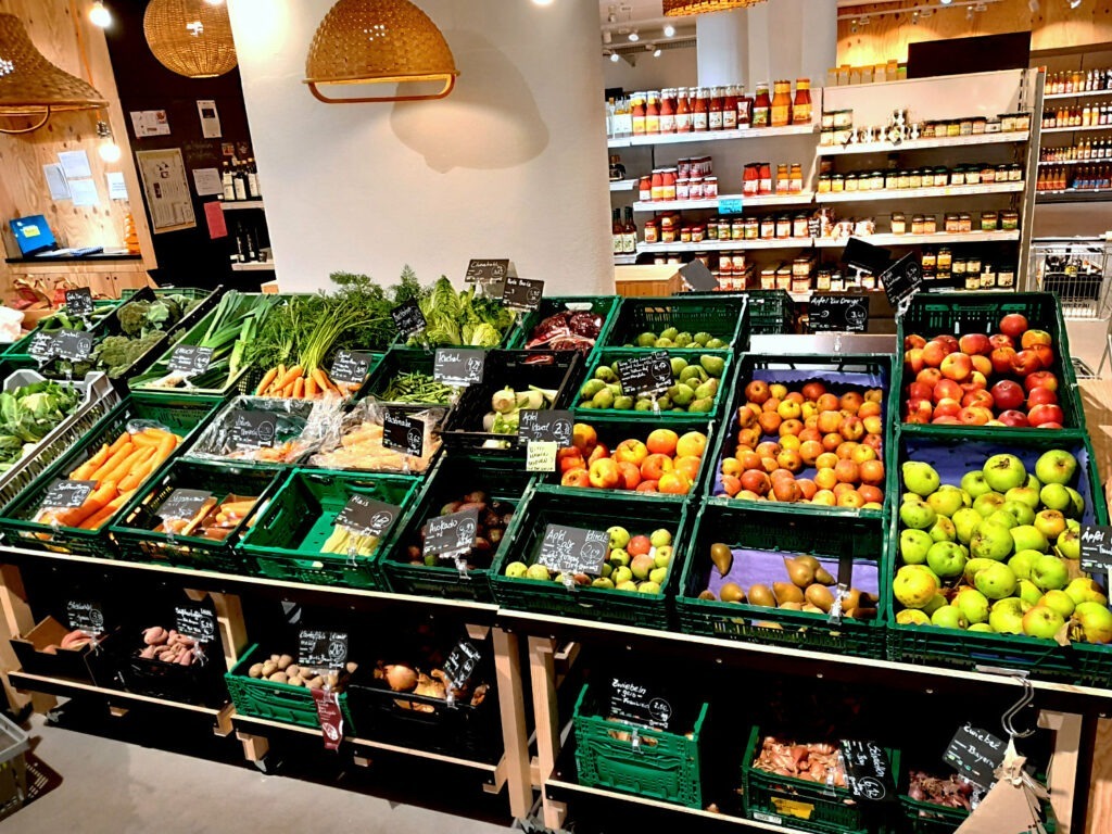 Die große offene Gemüseabteilung wirkt sehr einladend. Das Gemüse und Obst-Sortiment ist derzeit allerdings noch herausfordernd. Denn zur Zeit hat vieles was sie über den Handel beziehen keine zufriedenstellende Qualität. Hier sind sie erst noch im Aufbau und dabei gute Lieferant:innen zu finden.