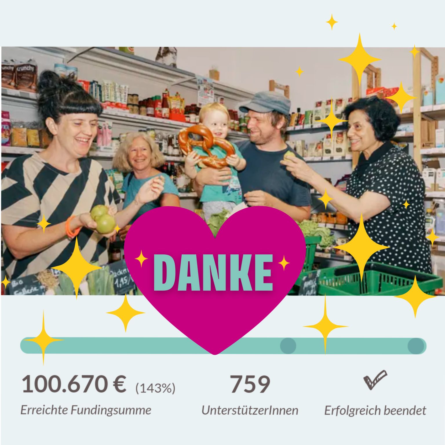 Besonders freuen wir uns, dass 495 Gutscheine im Gesamtwert von 46.000 € den Wareneinkauf für den Start 2025 vorfinanzieren – ihr legt damit den Grundstein für einen gelungenen Start unseres Mitmach-Supermarkts. Außerdem sind unsere Mitgliederzahlen dank der Kampagne kräftig gestiegen: Wir zählen jetzt 861 Mitglieder, davon allein 48 neue Mitglieder in den letzten 48 Stunden der Kampagne. Herzlich willkommen an alle Neuen!