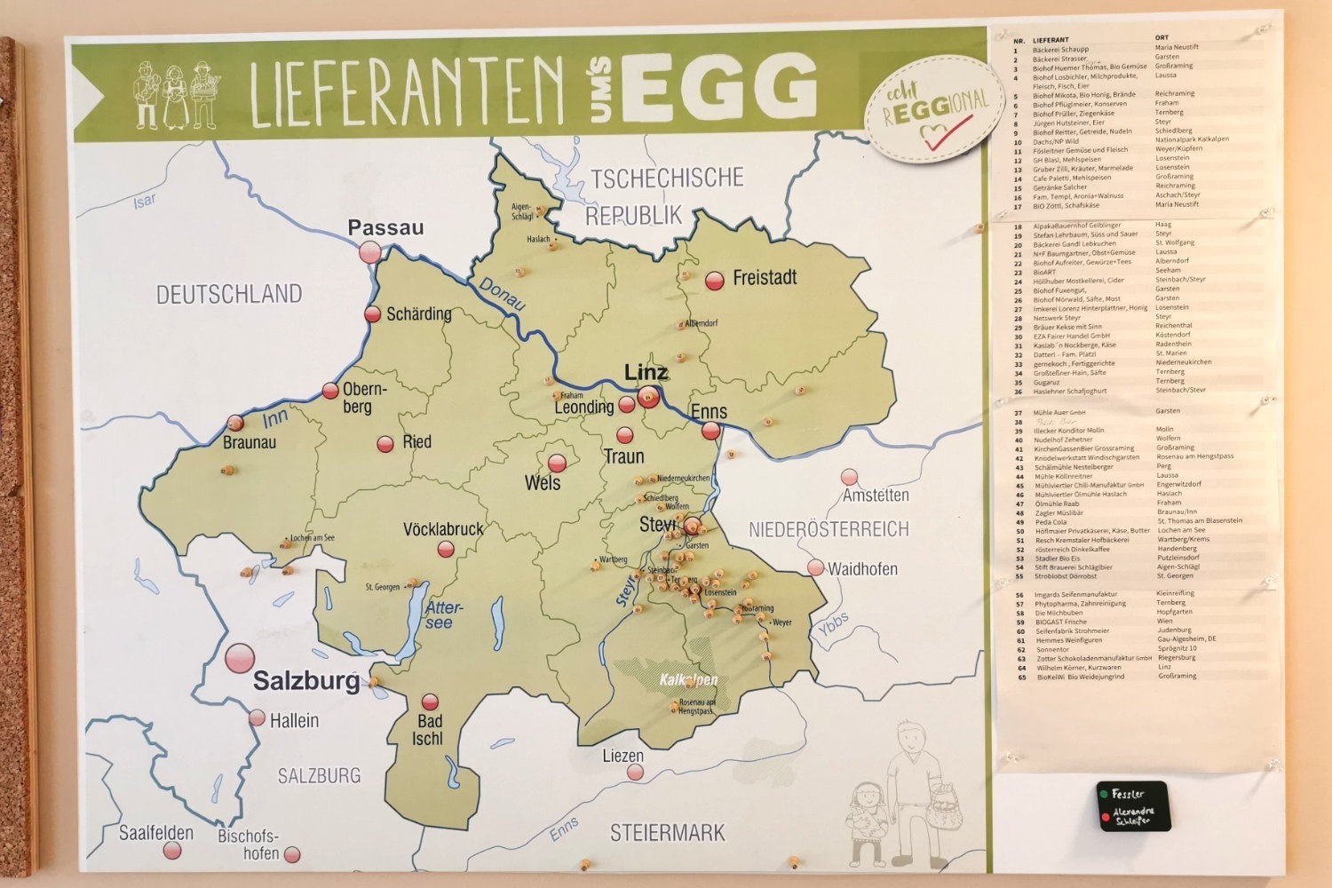 In Ardning leben gut 1.200 Menschen, es liegt 70 km südlich von Losenstein. In Pruggern leben knapp 800 Menschen, rund 100 km entfernt südwestlich von Losenstein. Beide Gemeinden liegen in der Steiermark. Das Regionalmanagement und der Bezirk Liezen kamen zu Um’s Egg und baten um Hilfe, die errichteten Nahversorger, die nicht funktionieren, ins Laufen zu bringen. Aus der anfänglichen Beratung wurden die zwei neuen Standorte von Um’s Egg. So können die Investitionen, wie die Bargeldautomaten und Selbstbedienungskassen, weiter genutzt werden und der Ort hat einen Nahversorger.