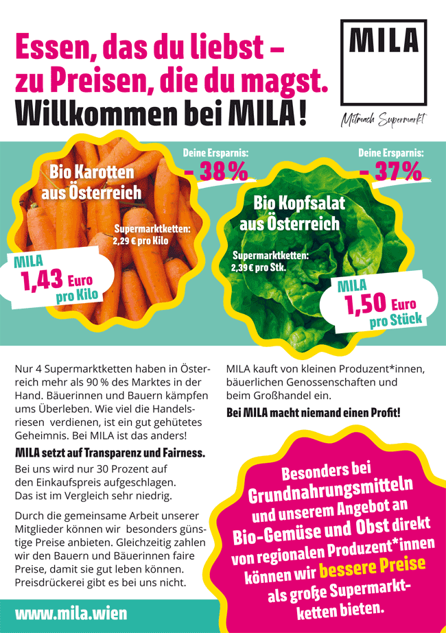 Everyone is feeling the pinch and having to dig deeper and deeper into their pockets when buying groceries! Only four supermarket chains hold more than 90% of the Austrian market. Farmers are fighting for survival. How much the retail giants earn is a well-kept secret. MILA is different!