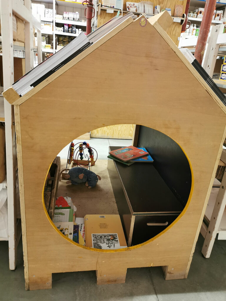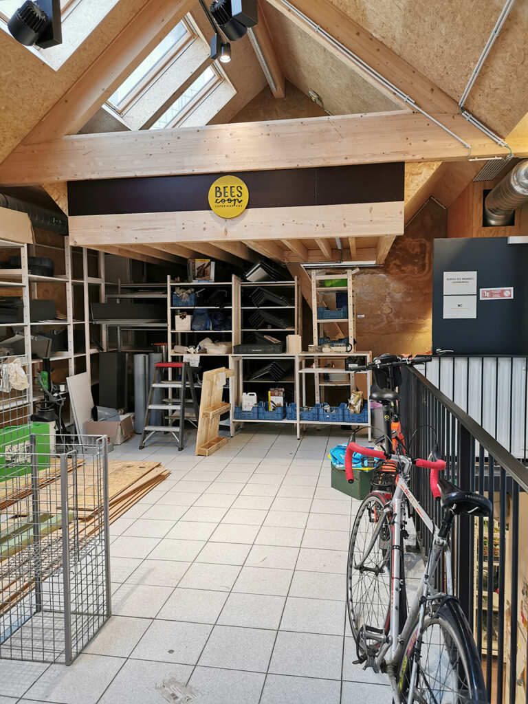 Für den Aufbau holte sich die BEES Coop Geld von der Bank. Diese verlangte Sicherheiten, deshalb kaufte die BEES Coop vor fünf Jahren das Grundstück mit Gebäude von der Mäzenin, um den Kredit abzusichern. Zwischenzeitlich hat die BEES Coop das Gebäude teils wieder auf- und umgebaut und isoliert. Das Dach wird gerade erneuert – jetzt kommt von oben Tageslicht ins Geschäft.