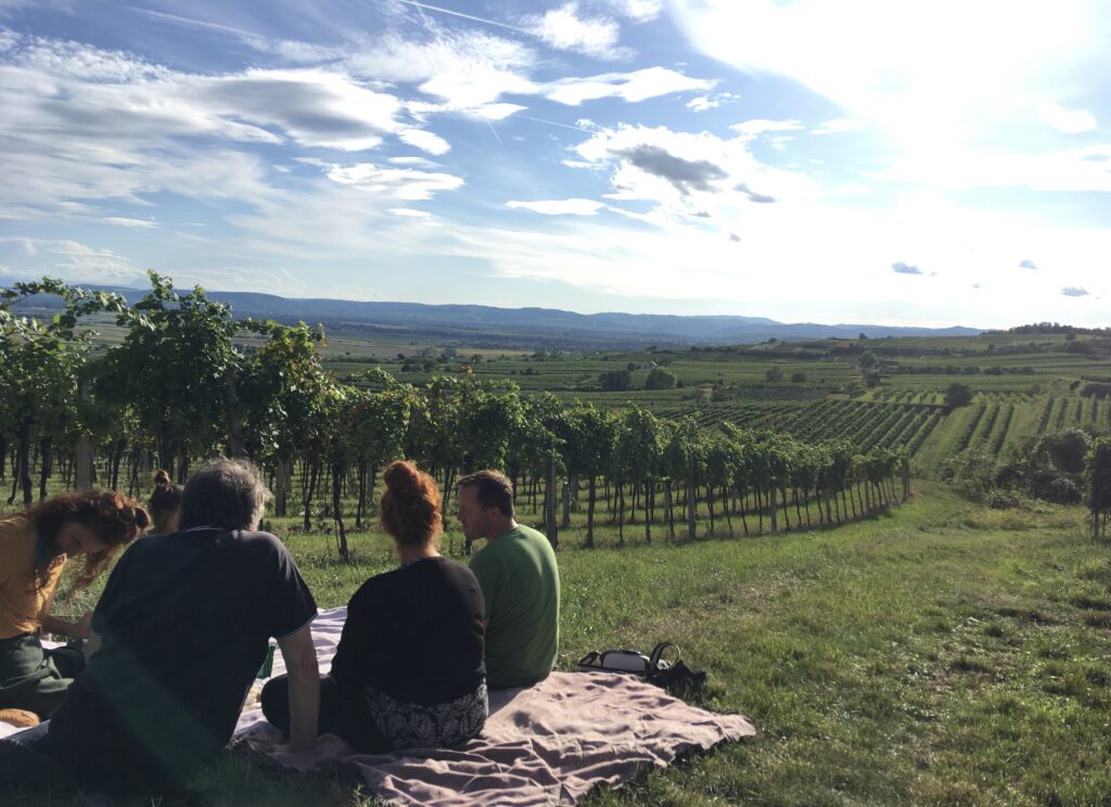 Verlässlichen Rotwein-Trinkgenuss bietet der „Oibelos“ auch bei dieser Verkostung, für Liebe auf den ersten Schluck sorgt der „Pinot Noir, 2020“. Der Winzer teilt meine Begeisterung für „mehr Blauburgunder“ nur bedingt, ergänzt lakonisch: „Es gibt gute, es gibt schlechte; und von manchen bekomme ich nur Kopfweh.“ Sagts und schmeißt uns kurzerhand raus, weil er mit der Gattin noch zum Essen ausgeht. Wir hängen noch ein Picknick mit sensationeller Aussicht auf Schneeberg, Ötscher und Stift Göttweig dran. Wir schmatzen hungrig Käse und Brot, ich (Heimfahrt-Chauffeurin) schlürfe Wasser und die anderen Oibelos dazu…