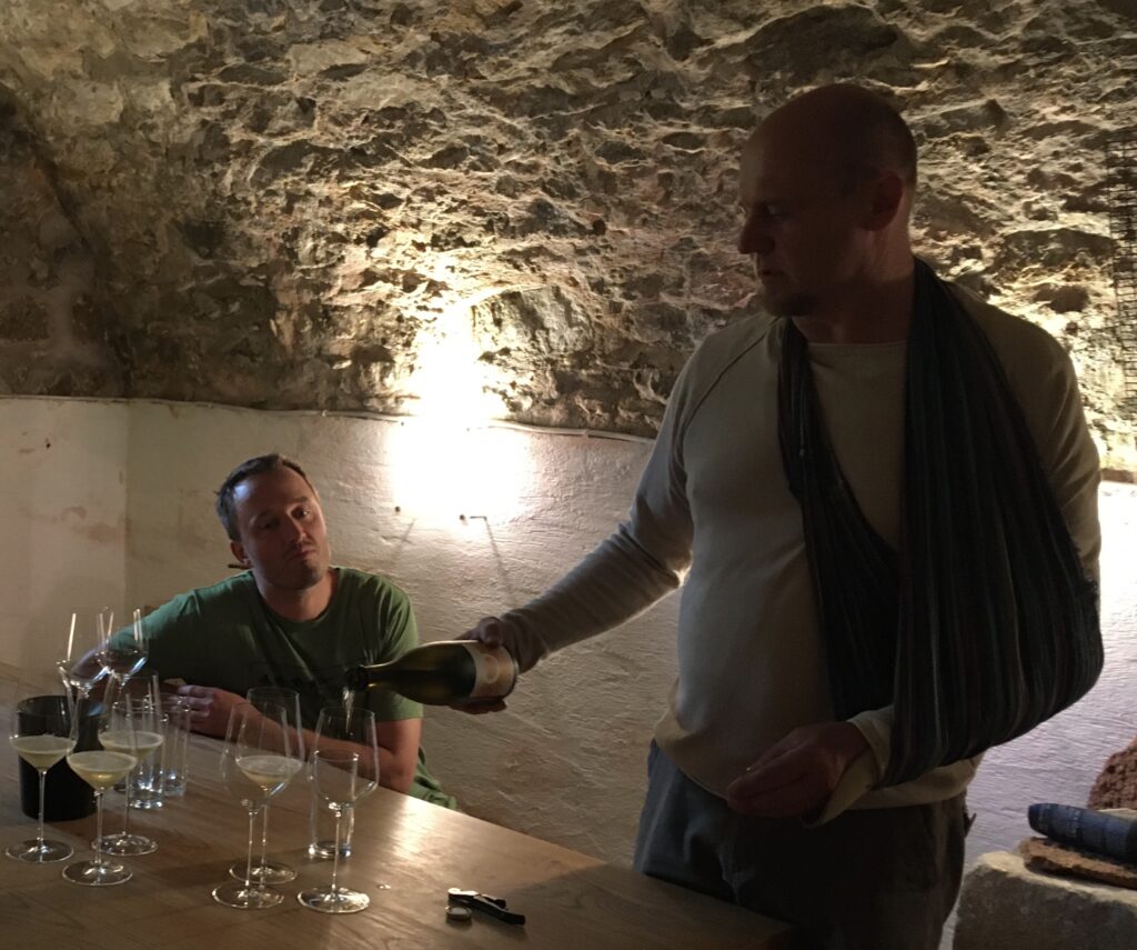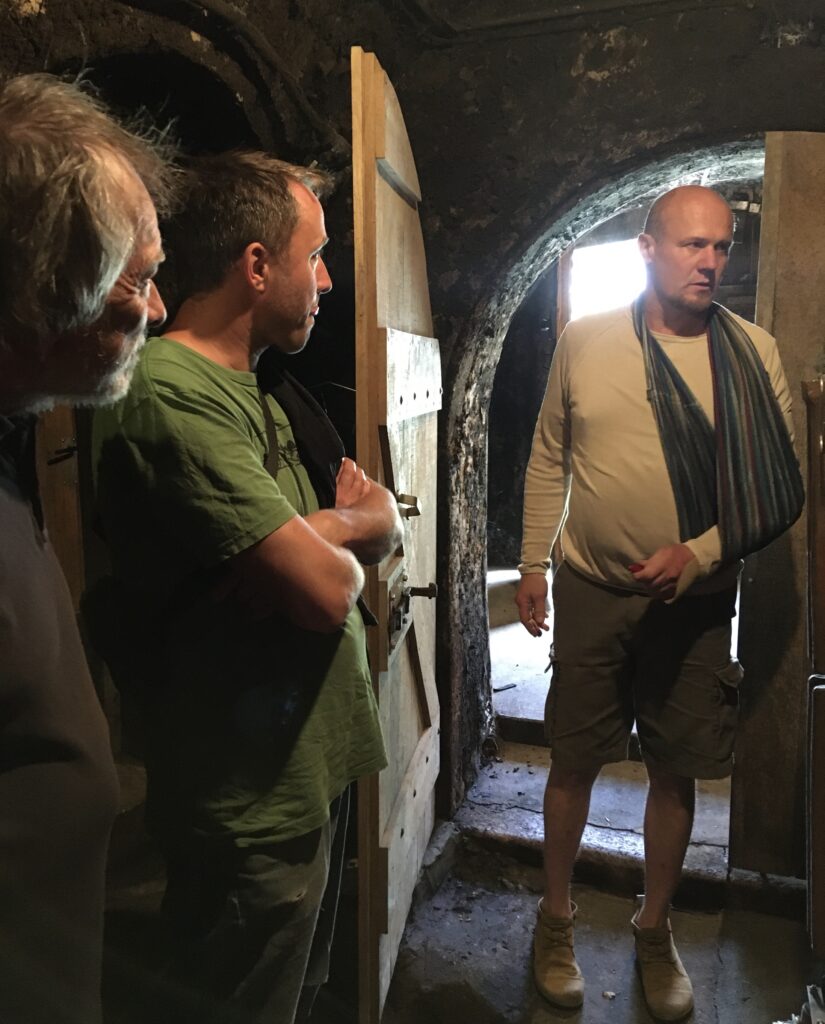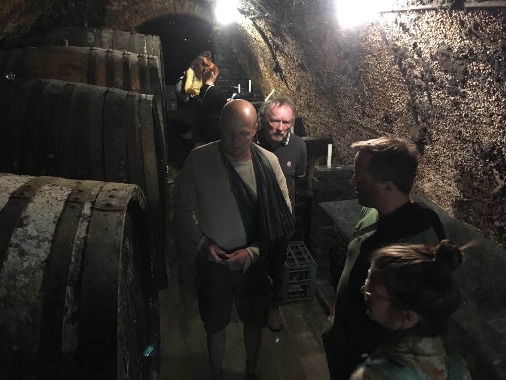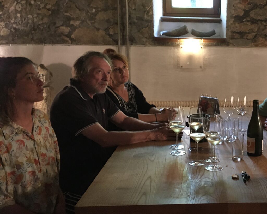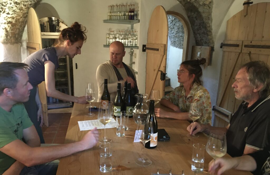 Die Autotüren fliegen auf, die Wein-Interessierten stieben ins Freie und stürzen hinein in den Hof, wo Winzerin Daniela Vigne alle Hände voll zu tun hat mit unangemeldeten Privatkund*innen. Wir schauen uns gleich einmal in der einladenden Türeinfahrt um, finden dort Infotafeln zu biodynamischen Grundlagen. In den folgenden zwei Stunden teilt Hausherr Toni Söllner praktisches Erfahrungswissen mit uns, hurtig folgen wir ihm in den alten Weinkeller (u.a. auch Vinothek). Ein kleiner Teil der Vinifizierung erfolgt hier im Holzfass, der Ausbau im Edelstahl-Tank bzw. in Steingut-Behältern ist auf weitere Gebäude verteilt.