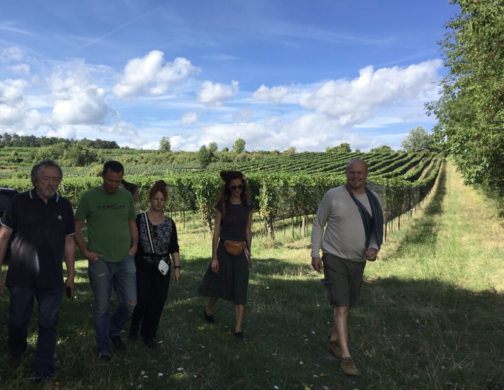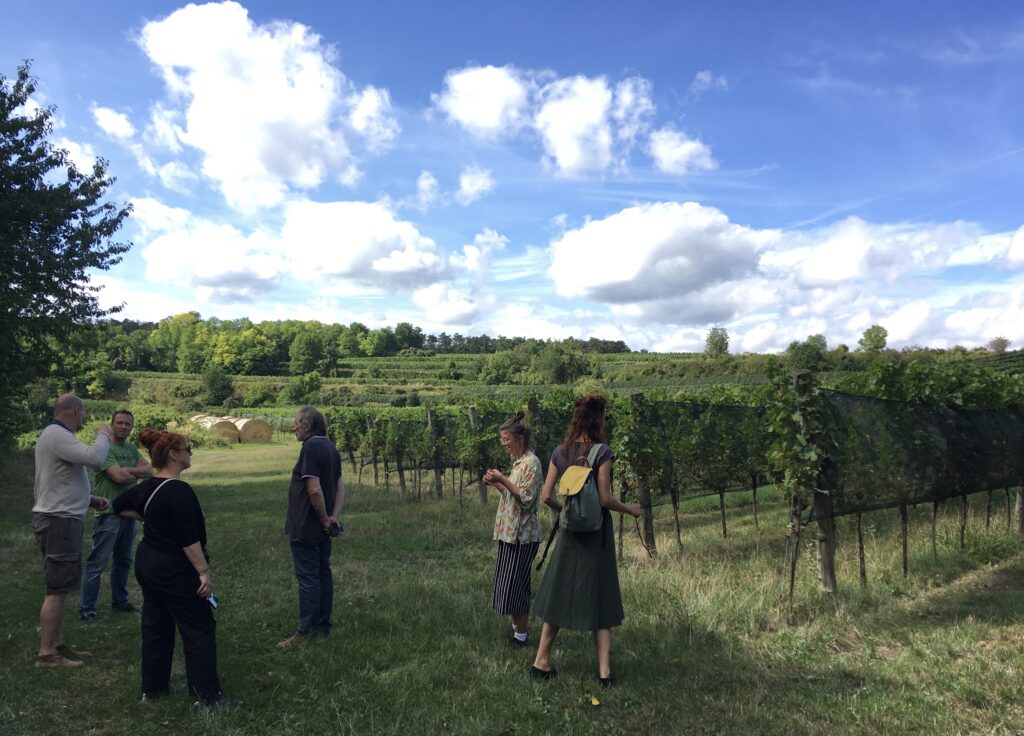 Nach kurzem Auffe-oben-Ume auf schmalem Feldweg, dem obligaten „Waaaahhhhs für eine Aussicht!“ von Gösing-Erstlingen, lauschen wir auch schon aufmerksam in der Ried Hengstberg (Grüner Veltliner), was es mit den schwarzen Netzen auf sich hat (vornehmlich Hagelschutz), warum Stroh ausgebracht wurde (Verdunstungsschutz) und wofür Gründüngung mit „hoher Mahd“, also dem Gegenteil von englischem Rasen, eigentlich gut ist (Bodenschutz, Humus-Aufbau u.a.). Wir staunen über das umfassende Wissen von Toni Söllner zu Theorie und Praxis generell, ganz speziell jedoch im Umgang mit der zunehmenden Wasserknappheit durch die Klimazerstörung. Sympathisch-humorvoll teilt er bereitwillig Trial-and-Error-Anekdoten, etwa über Feldversuche im buchstäblichen (Auspflanzung von Piwi-, sprich Pilzwiderständigen Rebzüchtungen) und im übertragenen Sinne. Besonders interessant finde ich, dass der Grüne Veltliner hier auf einem Gemisch aus Meeresboden mit Schotter wächst (während jener in der benachbarten Ried Welfel auf Muschelkalk und Meeressand steht).