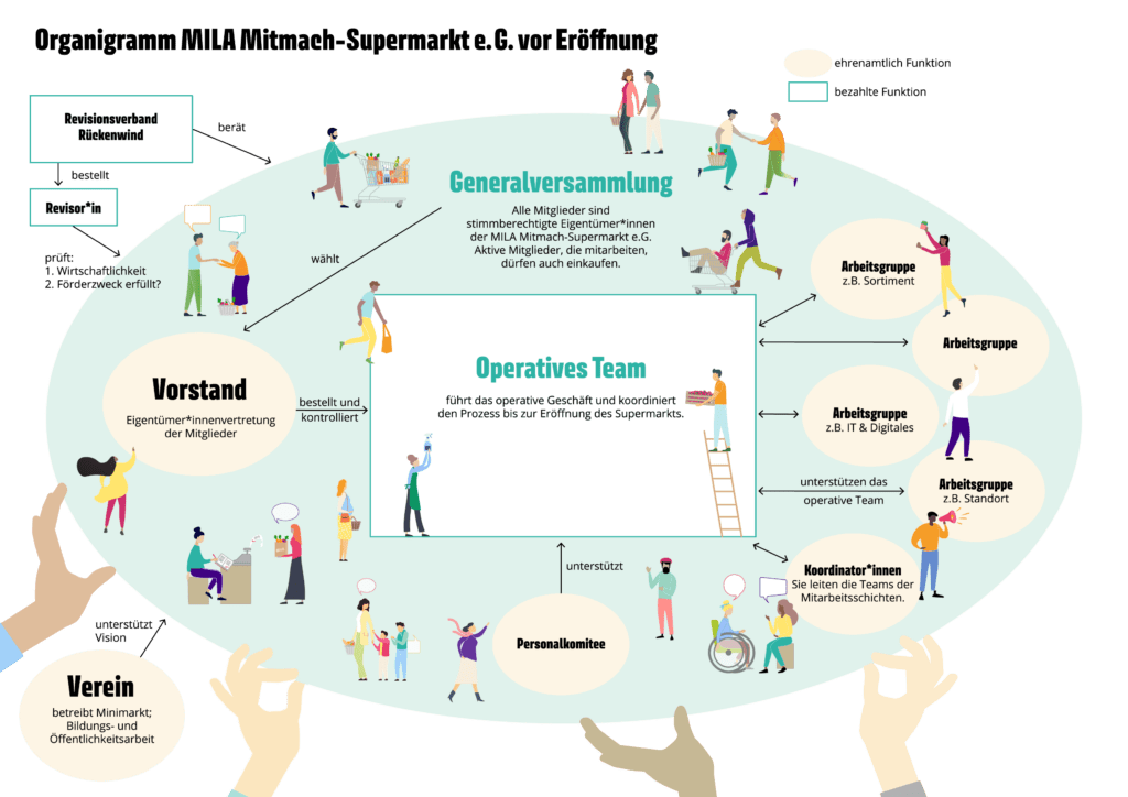 Spätestens nach der Genossenschaftsgründung wurde rasch klar, dass um den großen Supermarkt bald Realität werden zu lassen, das zu erwartende Arbeitspensum nicht mehr ehrenamtlich in der Freizeit bzw. neben anderer Jobs zu bewältigen sein wird. Es gab in den letzten Monaten im Zuge der Genossenschaftsgründung Einladungen an die Mitglieder sich für das Operatives Team (oder den Vorstand) zu bewerben. Der Genossenschafts-Vorstand beschloss in seiner ersten Sitzung ein monatliches Budget von 6.000 € für Personalkosten freizugeben. Das Operative Team wurden im Zuge dieser Entscheidung gebeten einen Vorschlag für zukünftige Anstellungen auszuarbeiten.